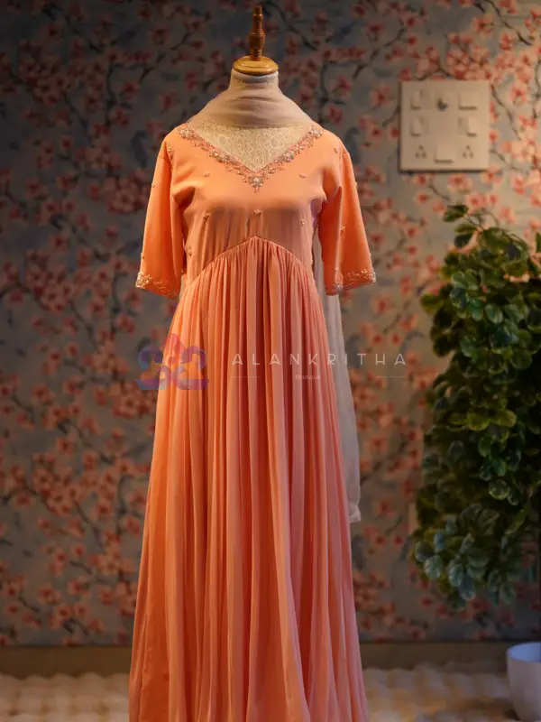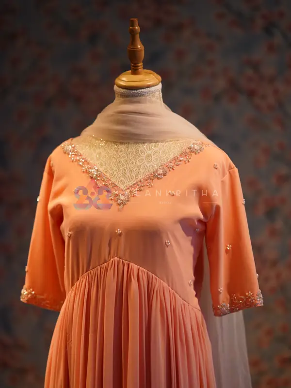 Color: Pastel Orange Aliacut • Style: Aliacut Top with Dupatta • Neckline: V-neck with hand embroidery • Sleeves: Embroidered sleeve ends • Work: Pure hand embroidery • Fit: Comfortable and flowy silhouette Perfect for those who love minimal elegance with handcrafted detailing.