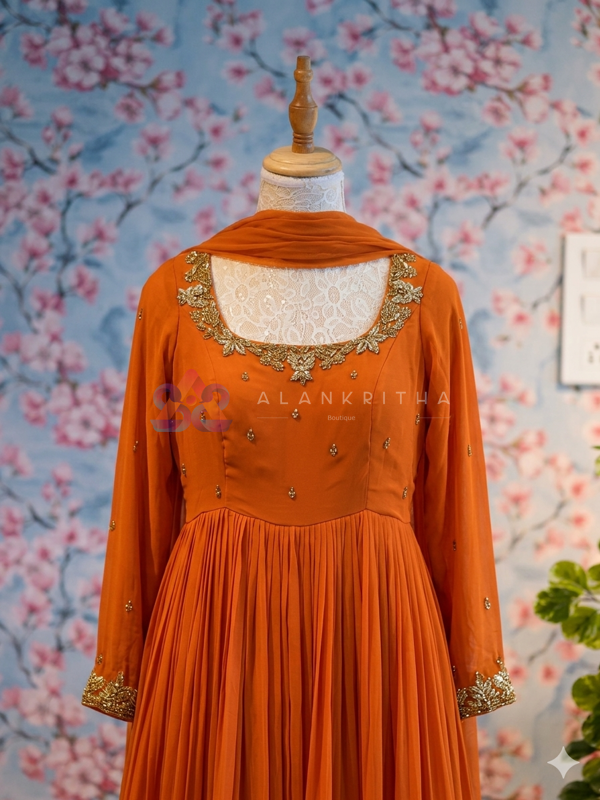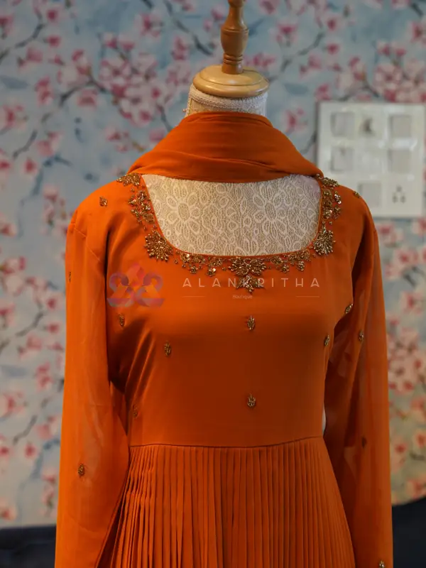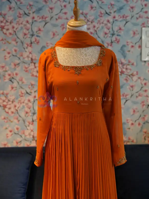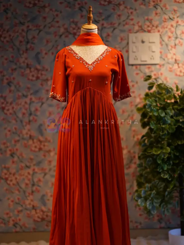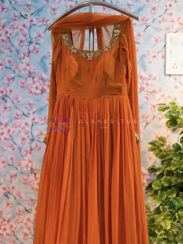 Details: • Color: Rust Orange • Style: Pleated Anarkali with Dupatta • Neckline: Round-neck with intricate hand embroidery • Sleeves: Embroidered sleeve ends • Work: Pure hand embroidery • Fit: Comfortable and flowy silhouette Designed for those who appreciate minimal elegance, this ensemble beautifully blends simplicity with handcrafted detailing, making it perfect for both everyday wear and special occasions.