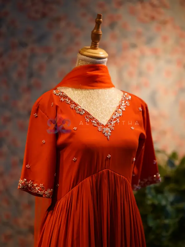 Color: Orange Aliacut • Style: Aliacut Top with Dupatta • Neckline: V-neck with hand embroidery • Sleeves: Embroidered sleeve ends • Work: Pure hand embroidery • Fit: Comfortable and flowy silhouette Perfect for those who love minimal elegance with handcrafted detailing.