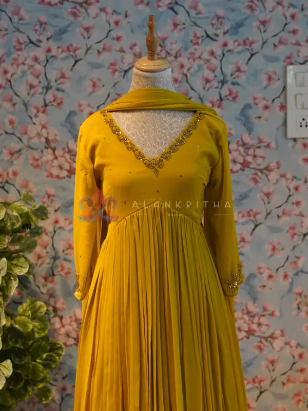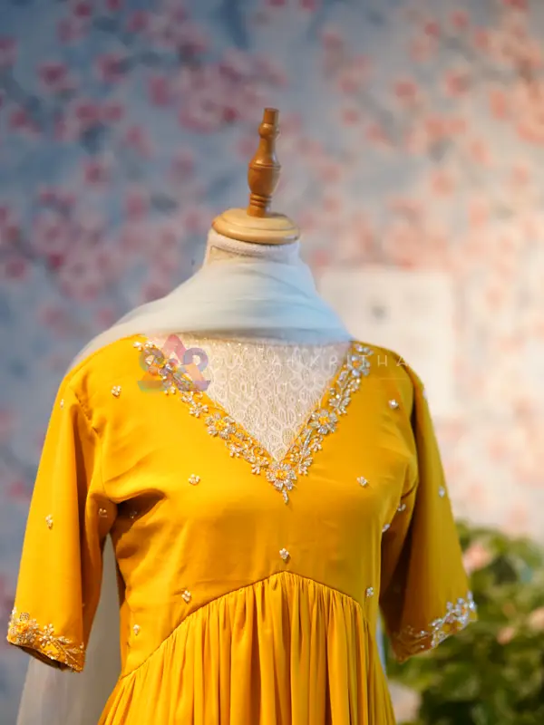 Details: • Color: Mustard Yellow • Style: Aliacut Top with Skirt and Dupatta • Neckline: V-neck with intricate hand embroidery • Sleeves: Embroidered sleeve ends • Work: Pure hand embroidery • Fit: Comfortable and flowy silhouette Perfect for those who love minimal elegance with beautiful handcrafted detailing, making it ideal for both everyday wear and special occasions.