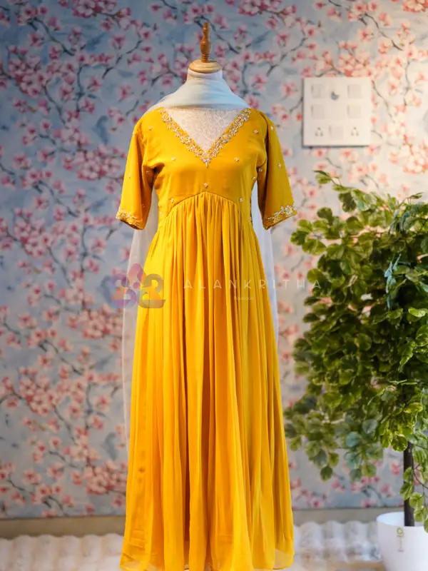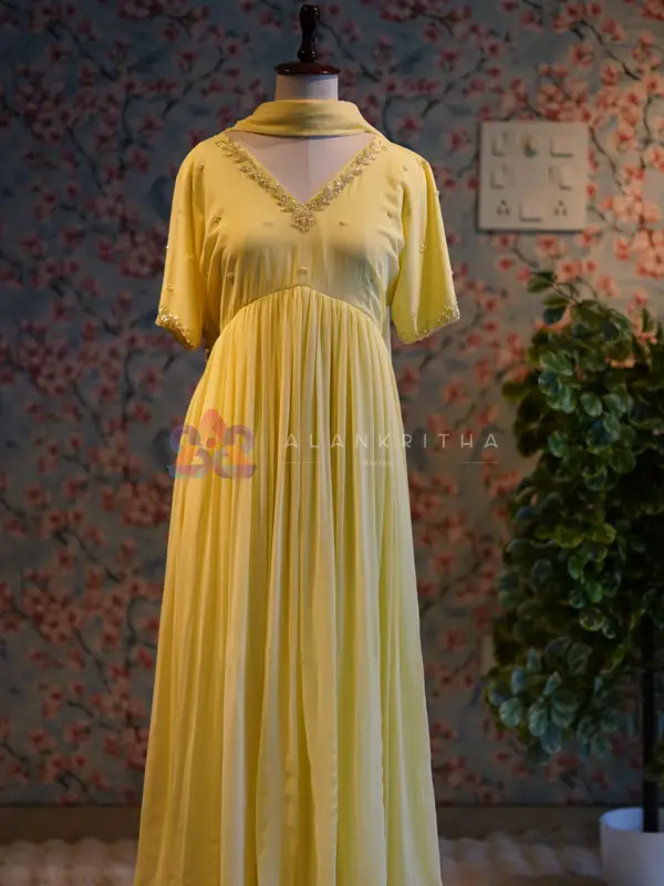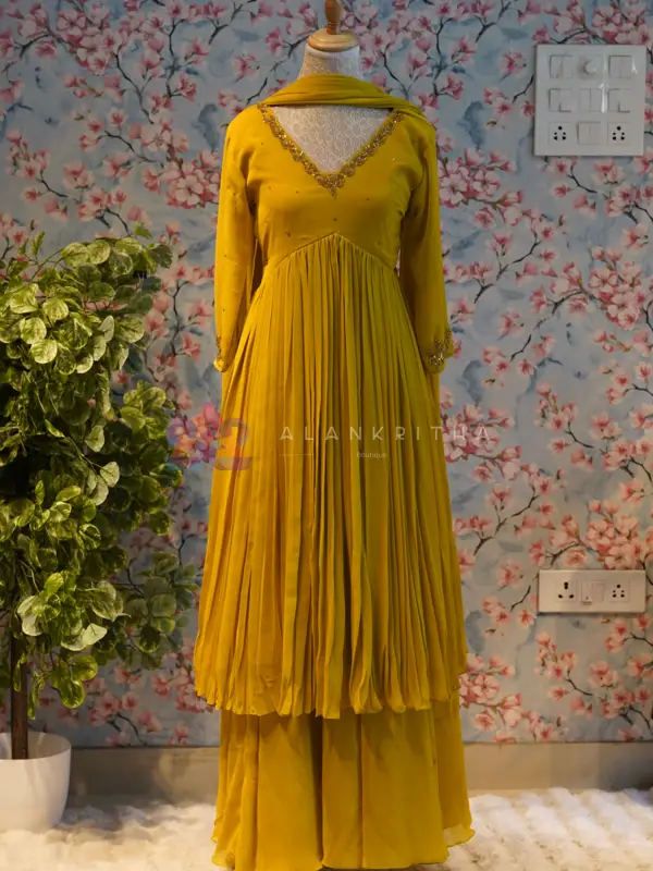 Details: • Color: Yellow • Style: Aliacut Top with Dupatta • Neckline: V-neck with intricate hand embroidery • Sleeves: Embroidered sleeve ends • Work: Pure hand embroidery • Fit: Comfortable and flowy silhouette Designed for those who appreciate minimal elegance, this ensemble beautifully blends simplicity with handcrafted detailing, making it perfect for both everyday wear and special occasions.