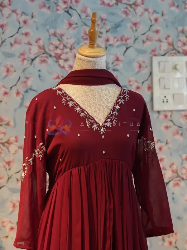 Color: Maroon • Style: Aliacut Top and Dupatta • Neckline: V-neck with intricate hand embroidery • Sleeves: Embroidered sleeve ends • Work: Pure hand embroidery • Fit: Comfortable and flowy silhouette Designed for those who appreciate minimal elegance, this ensemble beautifully blends simplicity with handcrafted detailing, making it perfect for both everyday wear and special occasions.