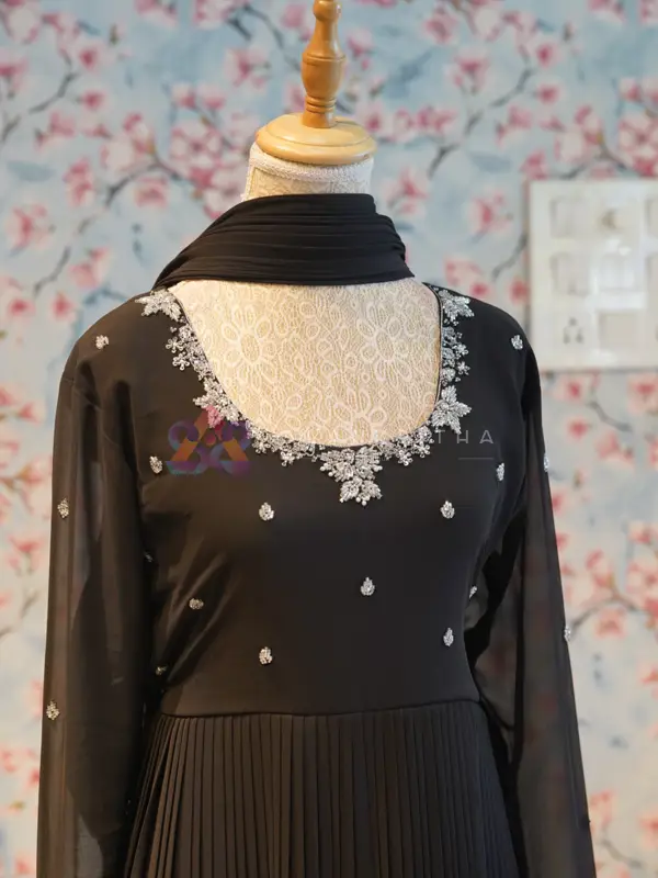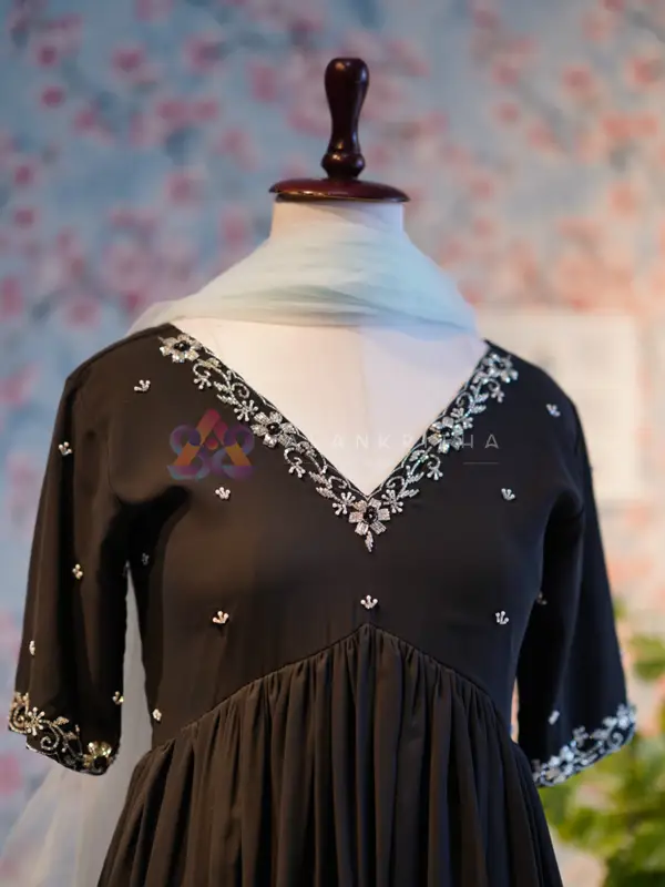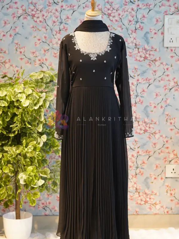 Details: • Color: Black • Style: Pleated Anarkali with dupatta • Neckline: Round-neck with intricate hand embroidery • Sleeves: Embroidered sleeve ends • Work: Pure hand embroidery • Fit: Comfortable and flowy silhouette Designed for those who appreciate minimal elegance, this ensemble beautifully blends simplicity with handcrafted detailing, making it perfect for both everyday wear and special occasions.
