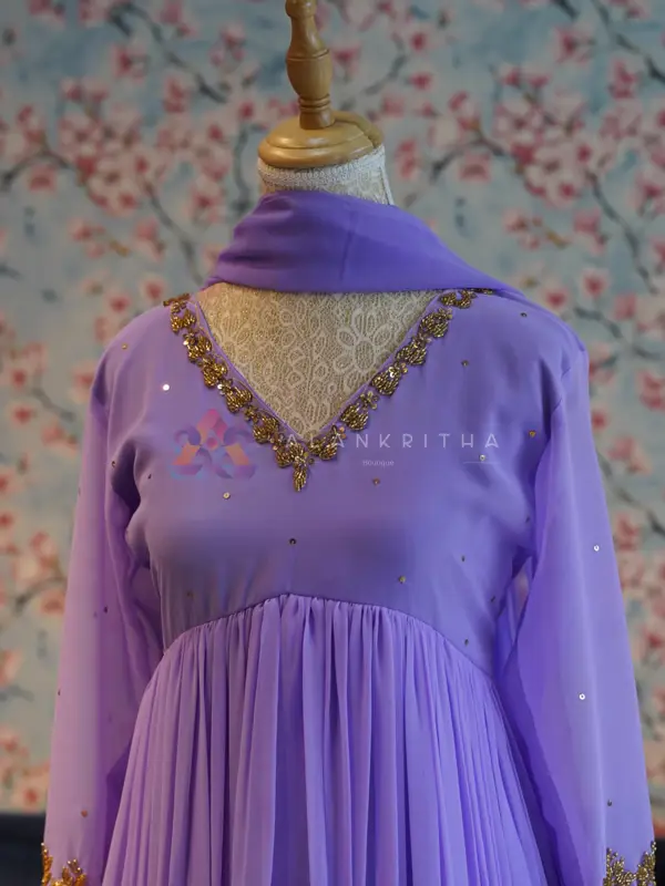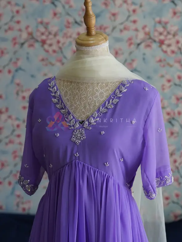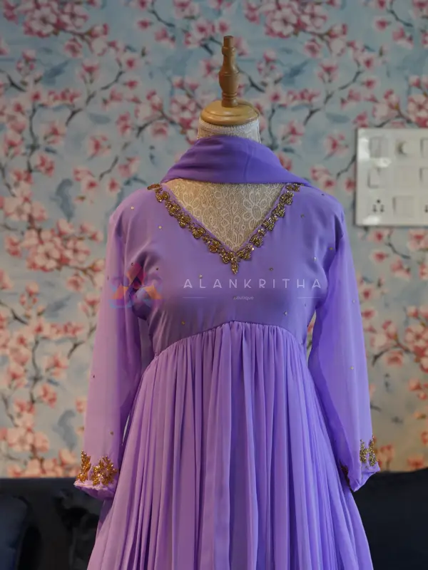 Details: • Color: Lavender • Style: Aliacut Top with Dupatta • Neckline: V-neck with intricate hand embroidery • Sleeves: Embroidered sleeve ends • Work: Pure hand embroidery • Fit: Comfortable and flowy silhouette Designed for those who appreciate minimal elegance, this ensemble beautifully blends simplicity with handcrafted detailing, making it perfect for both everyday wear and special occasions.