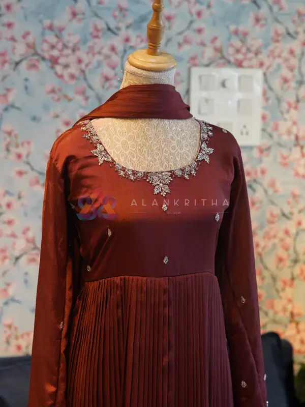 Details: • Color: Copper Brown • Style: Pleated Anarkali with Dupatta • Neckline: Round-neck with intricate hand embroidery • Sleeves: Embroidered sleeve ends • Work: Pure hand embroidery • Fit: Comfortable and flowy silhouette Designed for those who appreciate minimal elegance, this ensemble beautifully blends simplicity with handcrafted detailing, making it perfect for both everyday wear and special occasions.