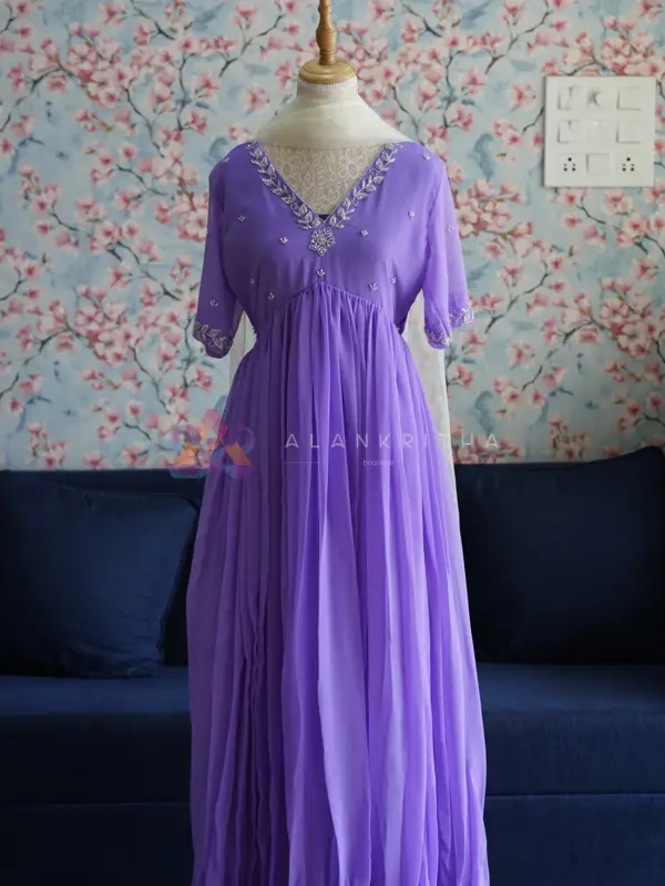 Details: • Color: Violet • Style: Aliacut Top with Dupatta • Neckline: V-neck with intricate hand embroidery • Sleeves: Embroidered sleeve ends • Work: Pure hand embroidery • Fit: Comfortable and flowy silhouette Designed for those who appreciate minimal elegance, this ensemble beautifully blends simplicity with handcrafted detailing, making it perfect for both everyday wear and special occasions.