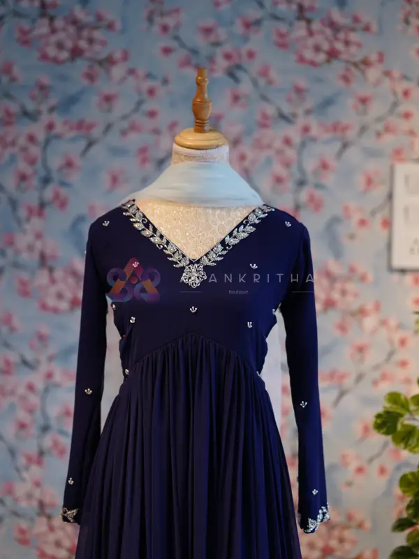 Elevate your ethnic wardrobe with this elegant navy blue A-line (aliacut) set, designed to offer both comfort and timeless style. Crafted in a flowy gathered silhouette, this outfit beautifully enhances your overall look with its graceful fall. The design features a flattering V-neckline adorned with intricate silver embroidery, complemented by matching silver work on the sleeve ends. The subtle detailing adds just the right amount of shimmer, making it perfect for both festive occasions and evening wear.