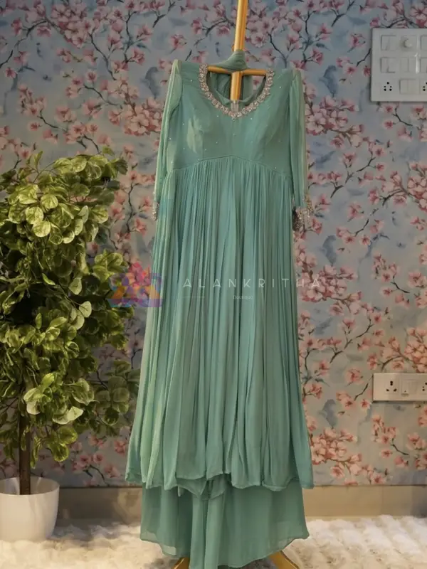 Color: Pastel Green • Style: Aliacut Top with Dupatta • Neckline: V-neck with hand embroidery • Sleeves: Embroidered sleeve ends • Work: Pure hand embroidery • Fit: Comfortable and flowy silhouette Perfect for those who love minimal elegance with handcrafted detailing.