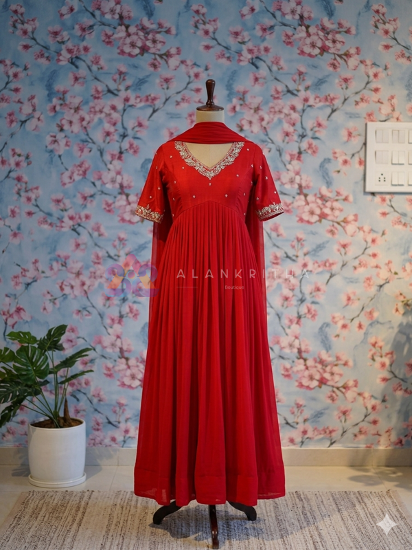 • Color: Red Aliacut • Style: Pleated Aliacut with Dupatta • Neckline: V-neck with intricate hand embroidery • Sleeves: Embroidered sleeve ends • Work: Pure hand embroidery • Fit: Comfortable and flowy silhouette Designed for those who appreciate minimal elegance, this ensemble beautifully blends simplicity with handcrafted detailing, making it perfect for both everyday wear and special occasions.